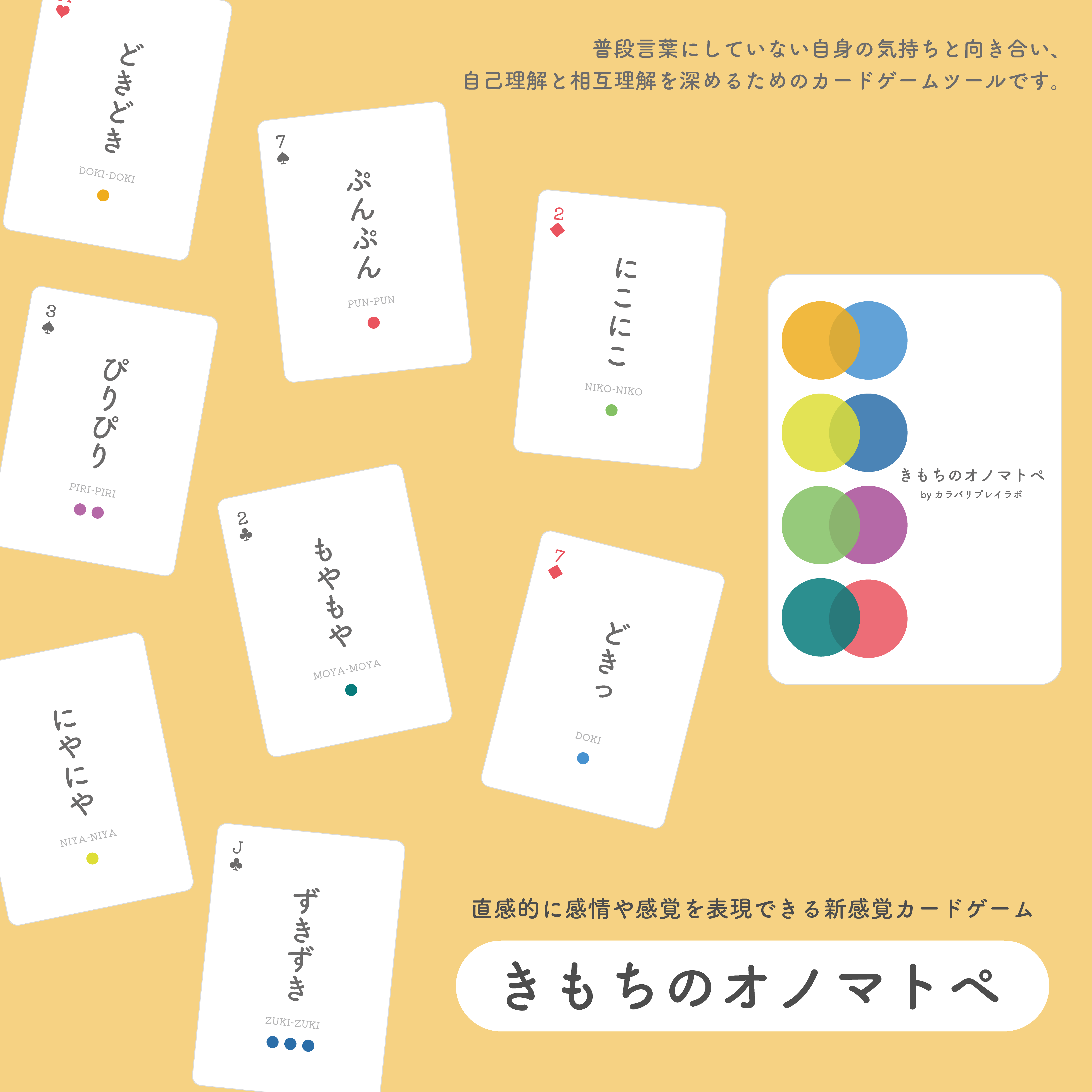 心の中の感情を表現するためのカードセットです。さまざまな感情を象徴するオノマトペが収められ、自分の気持ちを言葉にする手助けをします。